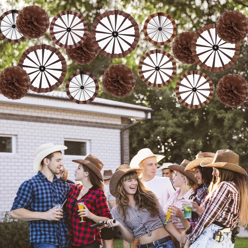 Outus 21 Pcs Western Party Hanging Decoration Wagon Wheel Paper Fans Brown Paper Pom Poms Country Western Hanging Fans Tissue Paper Flower for Wild Western Cowboy Themed Birthday Party Supplies Decor