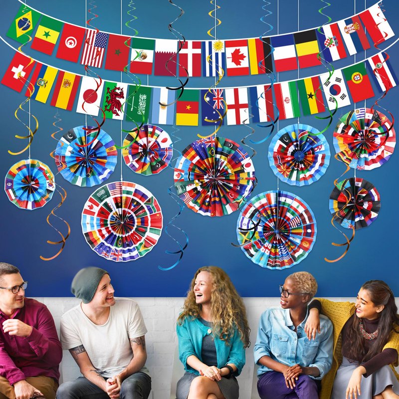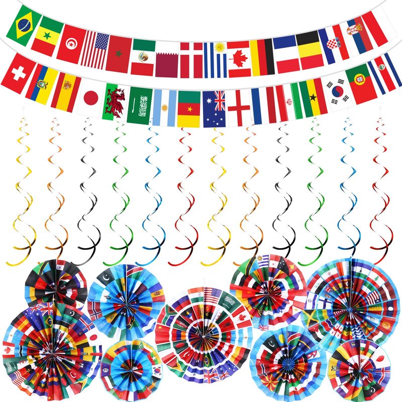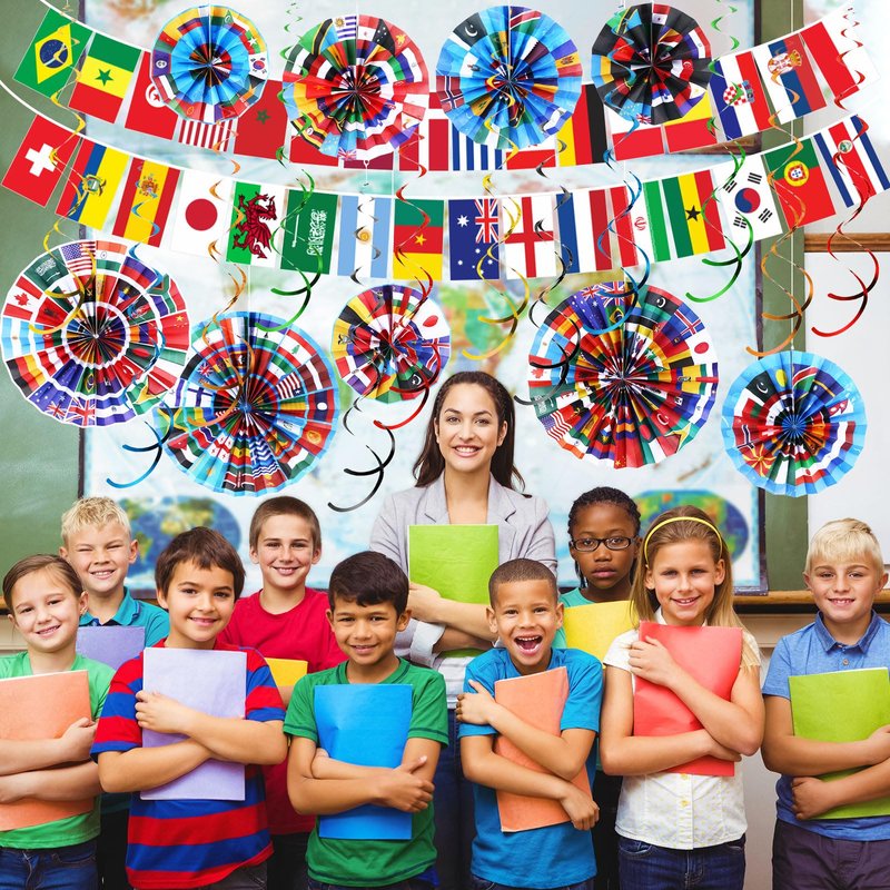 - Package Includes: you will receive 22 pieces of international decorations for classroom, including 9 pieces flag paper fans, 12 pieces hanging swirls and 1 string of world flags banner (10 meters), rich patterns and styles hanging together for a visual display, which can add a happy atmosphere to your international themed party