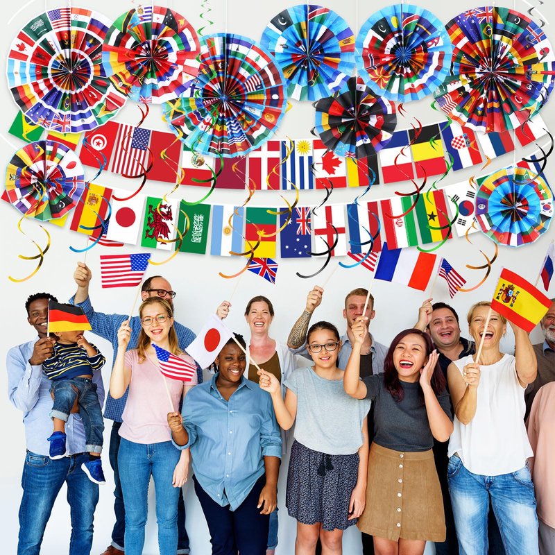 - Easy to Assemble: you simply unfold each country flags of the world paper fans and secure with the self adhesive sticker on the back of it, or use a gift paperclip; The banner and swirls are easy to hang and remove; You also can hanging them on the wall, ceiling, window, doorway, etc