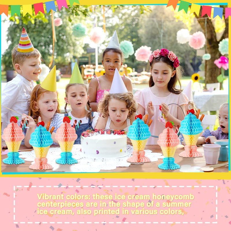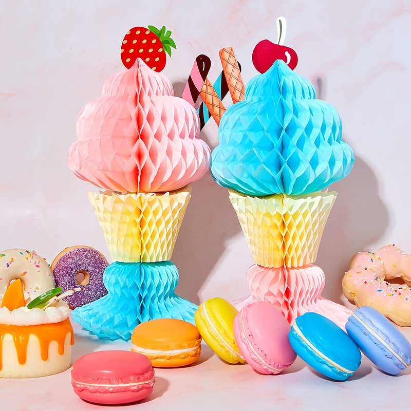 - Vibrant colors: these ice cream honeycomb centerpieces are in the shape of a summer ice cream, also printed in various colors, like red, pink and green, which will make your party bright and interesting