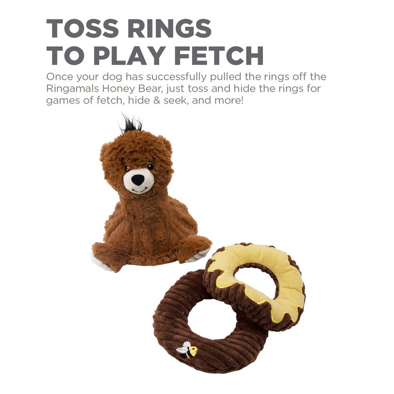 - TOSS RINGS TO PLAY FETCH: Once your dog has successfully pulled the rings off the Ringamals Honey Bear, just toss and hide the rings for games of fetch, hide & seek, and more!