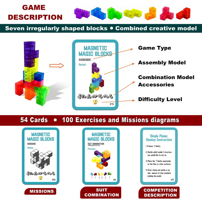 - 【Magic magnetic 3D cubes】 3D geometric crystal puzzles and 54 pcs guide board can be put together in 108 different shapes. You can also use your creativity to piece together any shape into a fun shape.