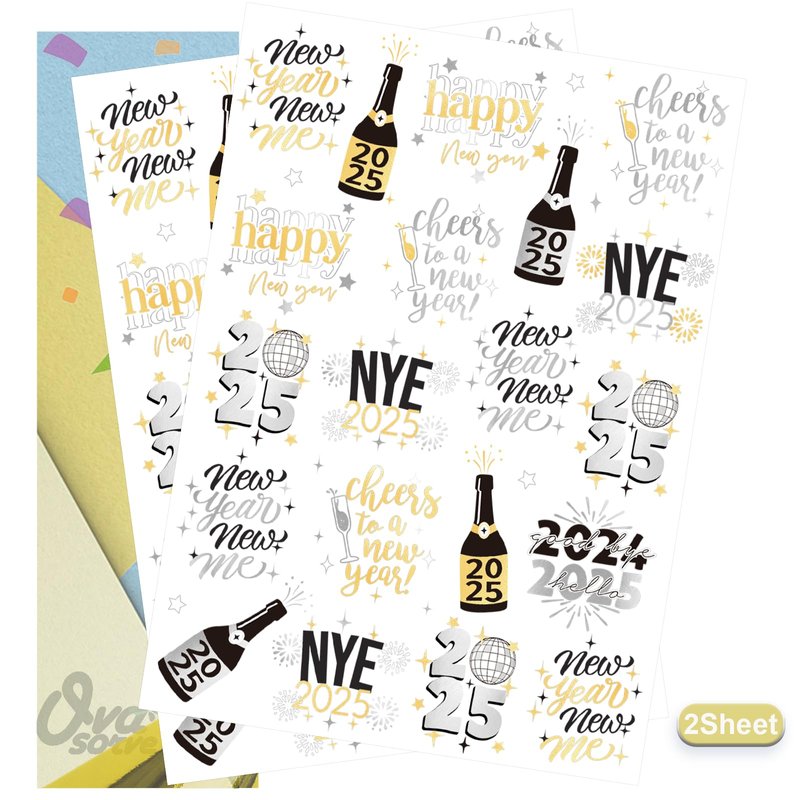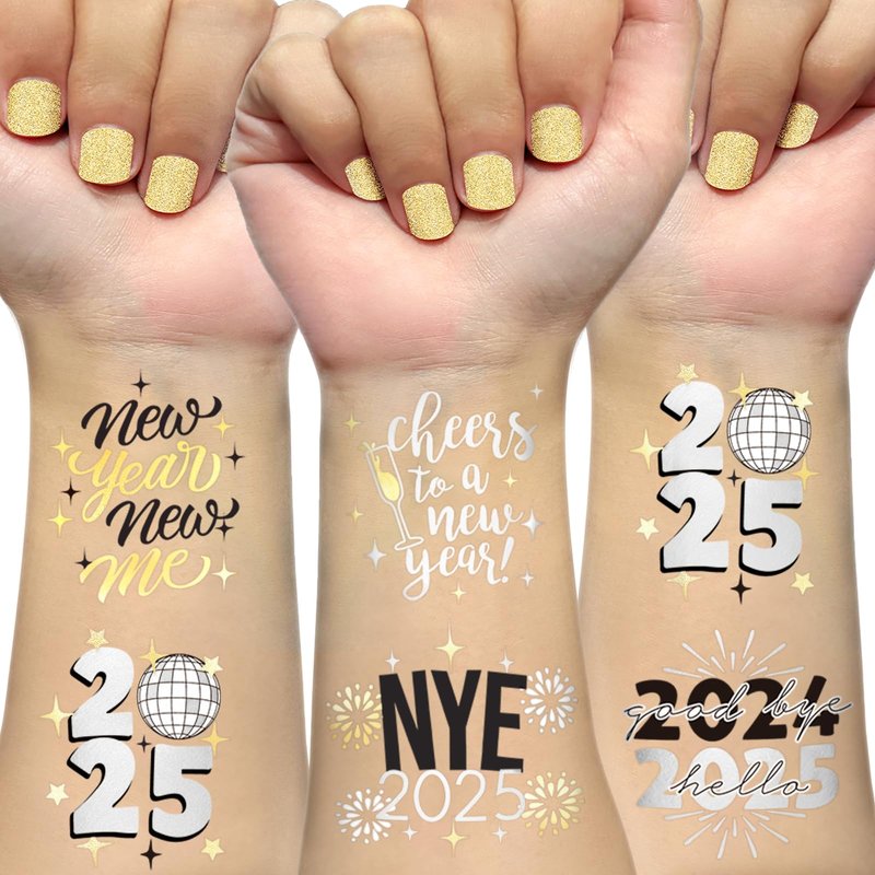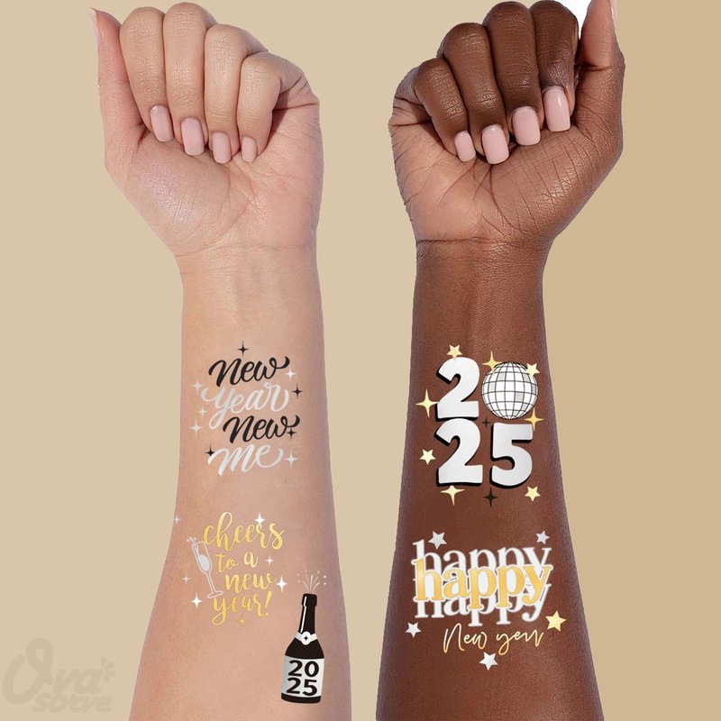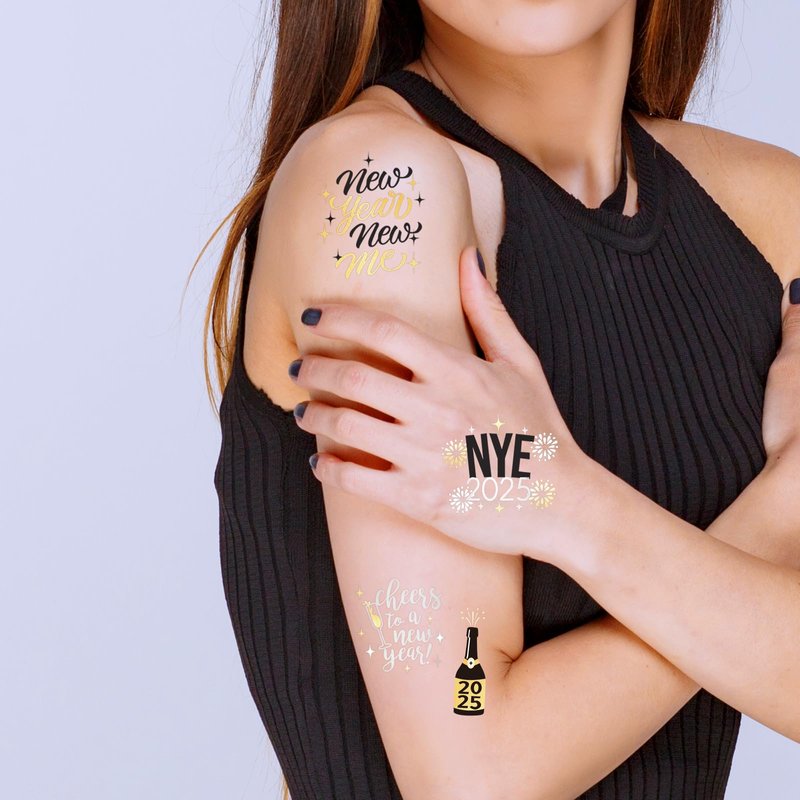 • Exclusive Design: Two sheets with a total of 40 colored + metallic tattoos. And the NYE tattoos featuring unique designs of cheers to a New Year, New Year New Me, Goodbye 2024 Hello 2025, Happy New Year designs that you will love.