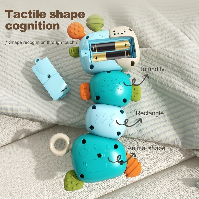 - As a baby music toy, it has four sections. The first section is the giraffe-shaped head. The second section has a switch button and a music button that, when pressed, produce lights and music. The third section is an oval-shaped ball that can be manually rotated. The fourth section can be shaken to make a rustling sound. Each section can rotate and make a clicking sound, making it easy for babies to grasp