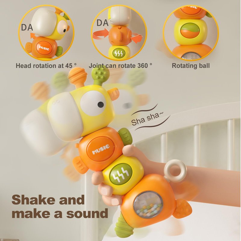 - It is a multifunctional yellow giraffe baby toy suitable for 6-18 months old infants. It is not only a rattle toy with music and lights but also a teething toy. It aids in sensory development and is perfect for soothing the baby to sleep and for parent-child interaction