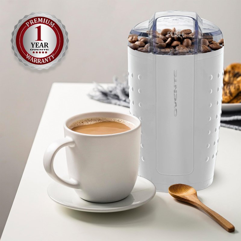 OVENTE Electric Coffee Grinder - Small Portable & Compact Grinding Mill with Stainless Blade for Bean Spices Herb and Tea, Perfect for Home & Kitchen - White CG225W