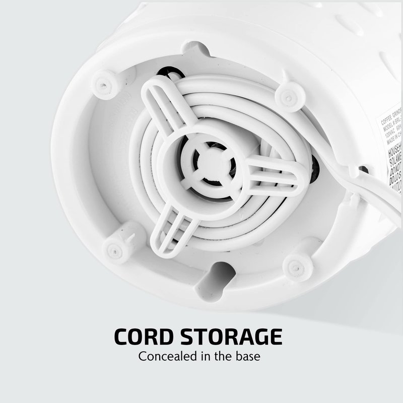 - Efficient – Powered by 150-Watt motor, it grinds fast while preserving aromatic flavors from coffee beans, herbs, spices, grains, etc. It can hold up to 2.5oz (70g).