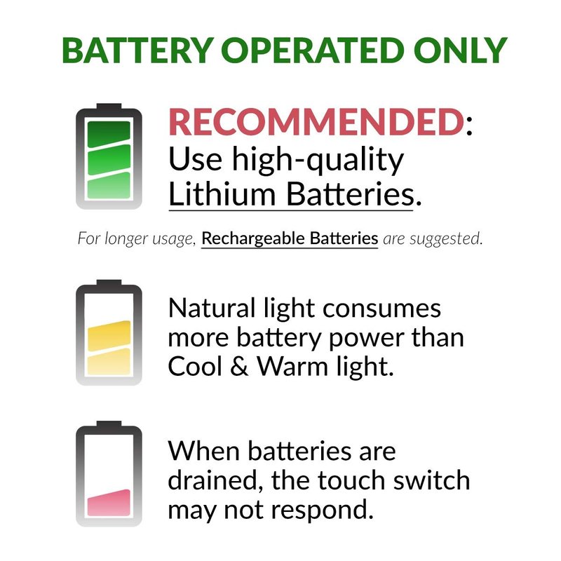 - Battery Operated – This mirror is powered by 3 C batteries (not included) for a clean, clutter-free, and cordless vanity space no matter where you go!
