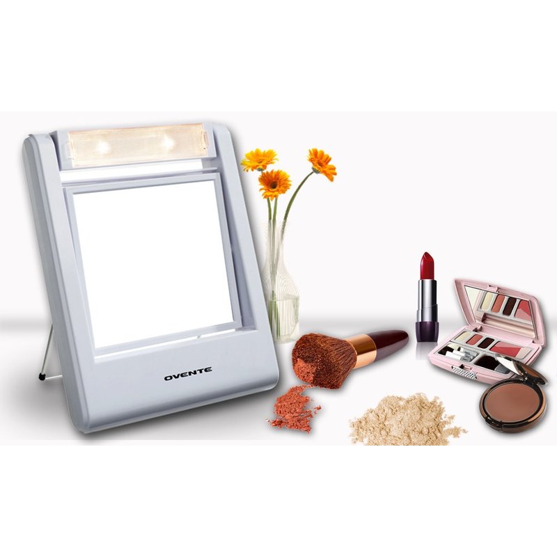 Ovente Square Makeup Mirror 5.5 Inch 1X 5X Magnification Glass LED Lighted 360 Degree Hand Held Double Sided Spinning Battery Operated Personal Compact Beauty Shaving Stand Plastic Travel White MLT22W