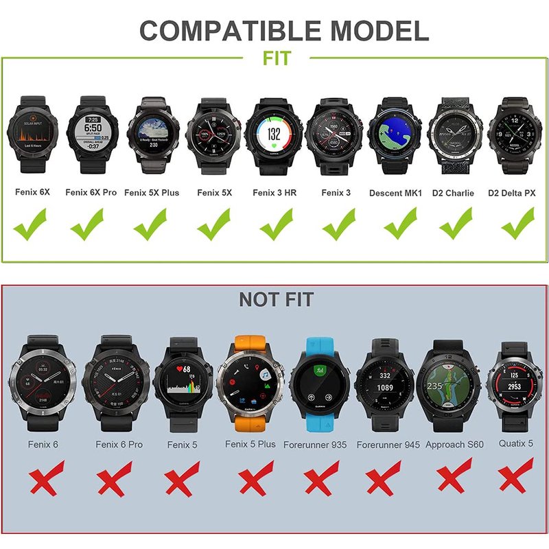 - - Make your smart watch uniquely yours with our compatible Garmin Fenix 5X replacement band. It fits smartwatches like Fenix 5X Plus, 6X, 6X Pro, 7X, 3, 3 HR, Descent MK1, D2 Delta PX, and D2 Charlie. (Note: Smart watch is NOT included.)