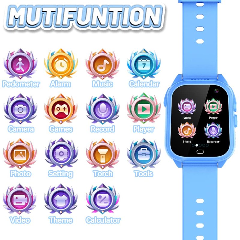- All in one smart wacth: It including camera, video, pedometer, voice recorder, puzzle games, diy wallpaper, alarm, clock, calculator, torch, music player, etc. There is no doubt that this will be a very good gift, as a partner to accompany the growth of children aged 3-12.