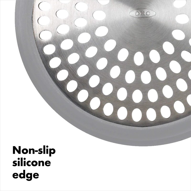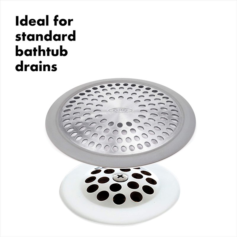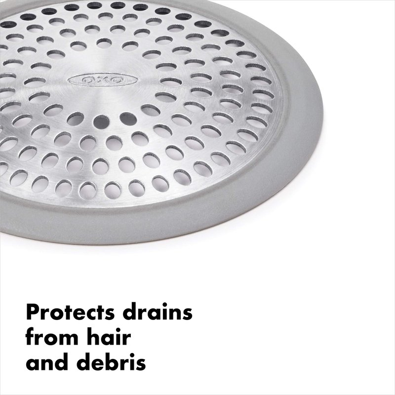 - Silicone rim helps keep Drain Protector in place. The hole pattern allows water to drain around debris