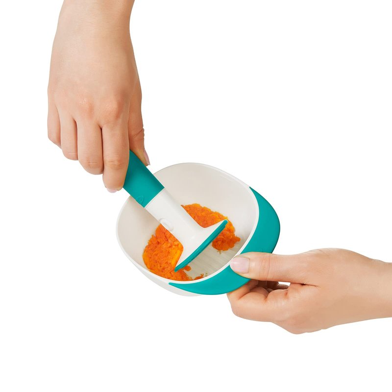 - Masher comes apart and fits inside the lidded bowl for meals on-the-go