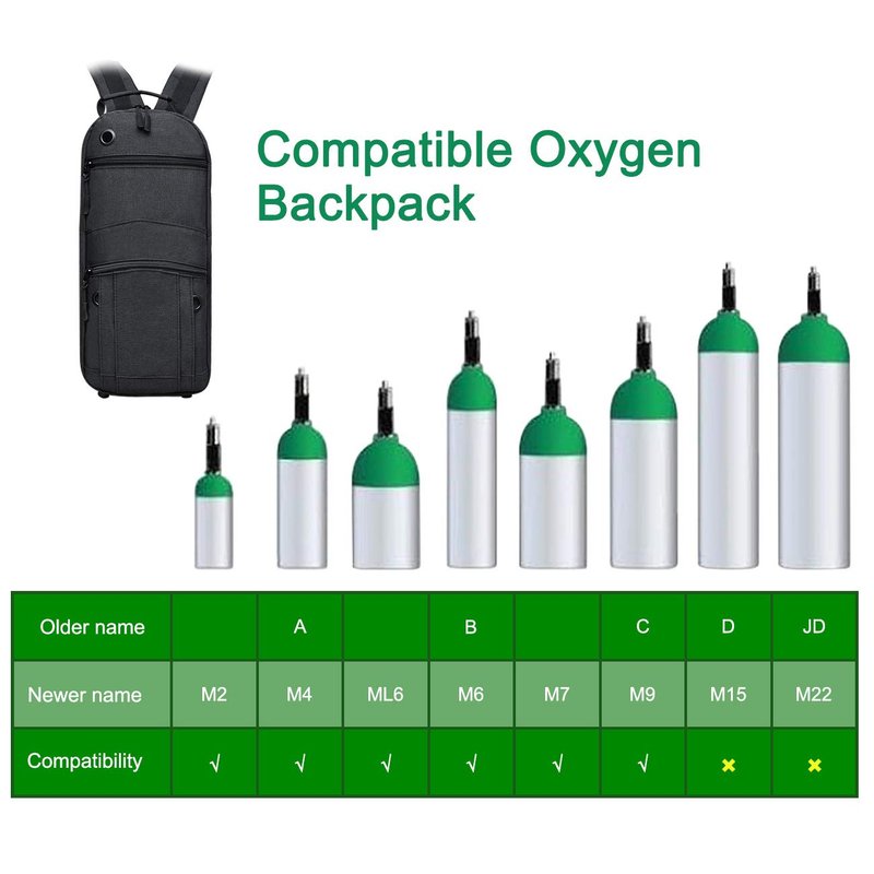 - The oxygen tank backpack fits size M2, M4(A), M6(B), ML6, M7 and M9(C).Please do not use with M15 oxygen tank . If your tank is size D, please choose our another Oxygen backpack.