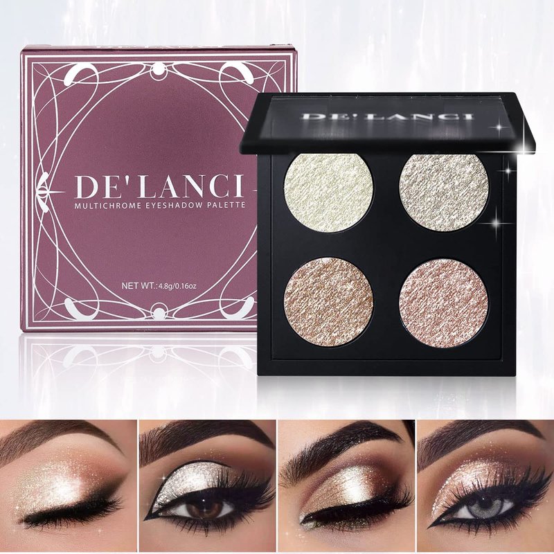 - ❤【The 4 color sparkle glitter eyeshadows palette】 : The 4 colors pressed luminescent glitter eyeshadow palettes include :glitter chameleon eyeshadow (white to gold),shimmer silver white color pearl ,shimmer natural warm champagne color,and shiny classic warm brown color.The high-shine metallic eyeshadow palette fit for beginners and professional to daily or party eyes /face/highlight makeup.