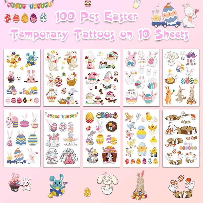 - Elevate your Easter celebrations with ozepao 100 Pcs Easter Luminous Temporary Tattoos for Kids. Featuring 100 adorable designs on 10 sheets, including bunnies, chicks, eggs, and gnomes, these tattoos bring a festive and playful atmosphere to your Easter festivities.