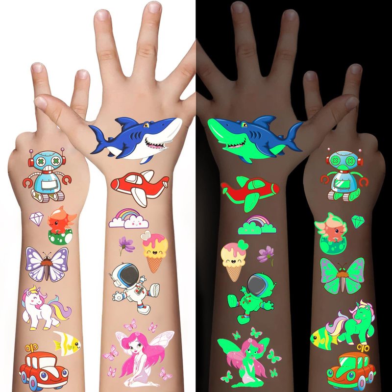 Versatile Usage: These fantastic tattoos are perfect for a multitude of occasions, including birthday parties, decorations, party favors, gift bag fillers, DIY projects, school carnivals, summer festivities, pool and beach activities, and as delightful gifts or rewards for kids. Glow in the Dark: These tattoos absorb sunlight during the day and glow at night.If the glow fades, re-expose them to sunlight to restore their brightness.