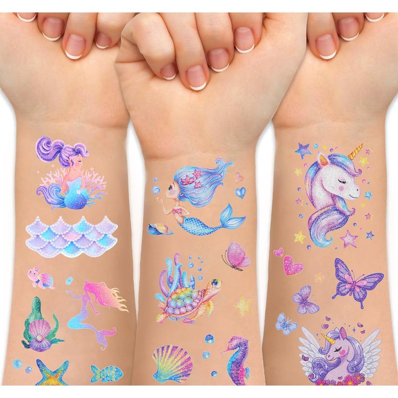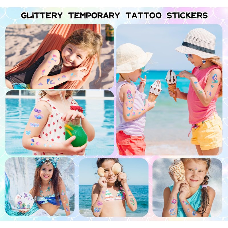- 🧜♀️ Widely Used: These awesome tattoos can be used for various occasions, such as birthday party supplies, decorations, party favors, gift bag fillers, DIY decorations, school carnivals, summer party kids' body decoration, pool and beach activities, or as gifts and rewards for kids.