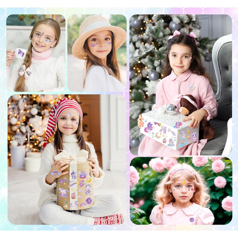 - 🦄12 Sheets Glitter Tattoos for Kids: Includes over 90 styles of glitter tattoos for girls' party supplies. Each sheet contains a variety of elements, such as mermaids, unicorns, butterflies, rainbows, sea creatures, seashells, and jellyfish. Popular among little girls, they are perfect for spring and summer-themed parties.