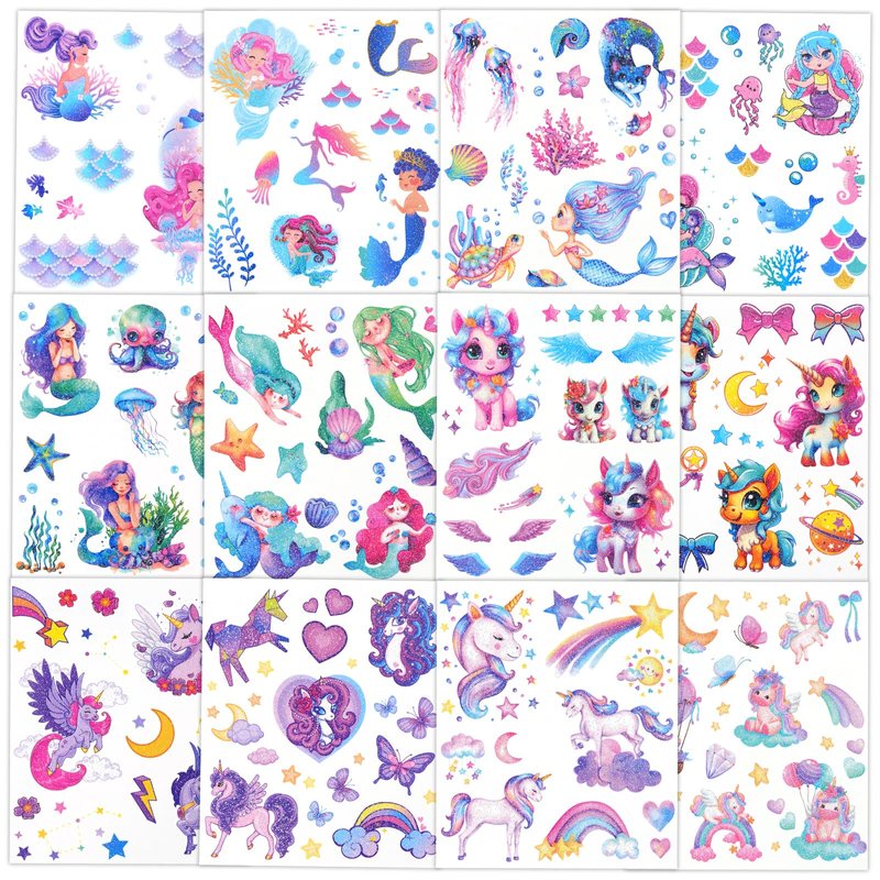 12 Sheets Glitter Mermaid Unicorn Tattoos