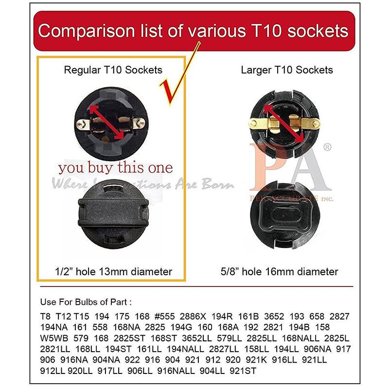 ●Socket for 194/168(T3-1/4) type Miniature Wedge Base bulbs. ●Socket type with solder terminals and mounting hole. ●Compatible with miniature wedge base bulbs. ●Built to strict quality control standards ●Direct replace and use Make sure the prongs positions are correct to your application cause some applications the prongs are twisted (Check above photo description pls.) ●Available to use in CAR/MOTORCYCLE/SCOOTER/TRUCK ●Base :Miniature Wedge Type:Wedge Base Sockets Bulb socket fits a 1/2" or 13mm diameter hole. 194 = W5W 147 152 158 159 161 168 184 192 193 259 280 285 447 464 501 555 558 585 655 656 657 1250 1251 1252 2450 2652 2921 2825 PC 175 2886X ●All new and ready to ship in stock package