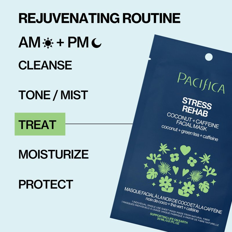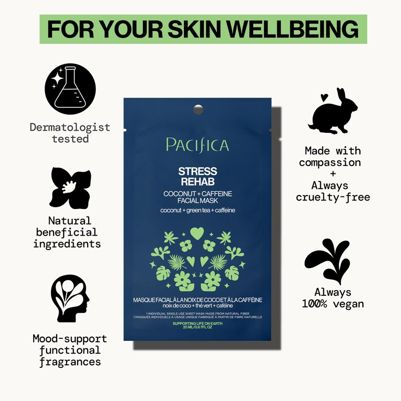 - WAKE UP YOUR SKIN WITH CAFFEINE and feel how soft your skin can be with the Pacifica Beauty Stress Rehab sheet mask