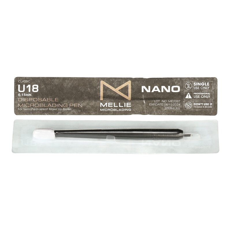PACK OF 10 Mellie Microblading U18 NANO .15mm Disposable Microblading Pen with Pigment Sponge - Thinnest Blade on the market - Eyebrows NOT FOR LATEX