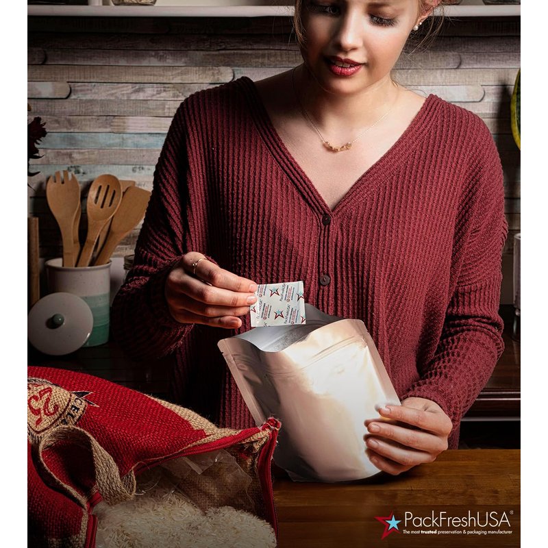 PackFreshUSA: 100 Pack (10 x 10 Packs) - 300cc Oxygen Absorber Packs - Food Preservation - Long-Term Food Storage Guide Included
