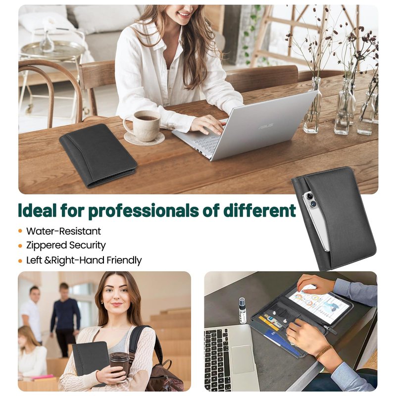 - SLEEK & PROFESSIONAL - Made for professionals to fit most briefcases & bags. Includes business cards slots, a pen holder & refillable writing pad
