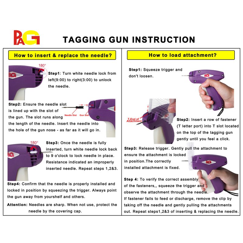 - ▶Ideal choice for all forms of standard tag. PAG standard tag gun can be used with most sizes or brand standard attachments. What's more, you can learn to use the tag gun and replace fasteners and needles within one minute as long as you read the instructions we provide