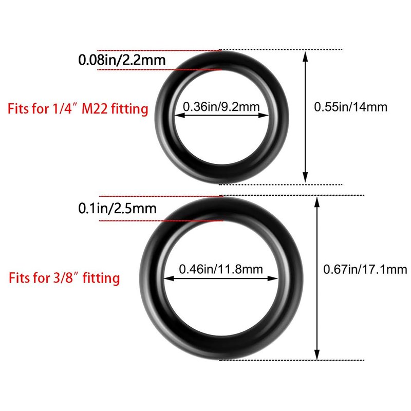 • Size: O ring size for 1/4 inch: outside diameter: 14.0 mm; Inside diameter: 9.2 mm O ring size for 3/8 inch: outside diameter:17.1 mm; Inside diameter: 11.8 mm