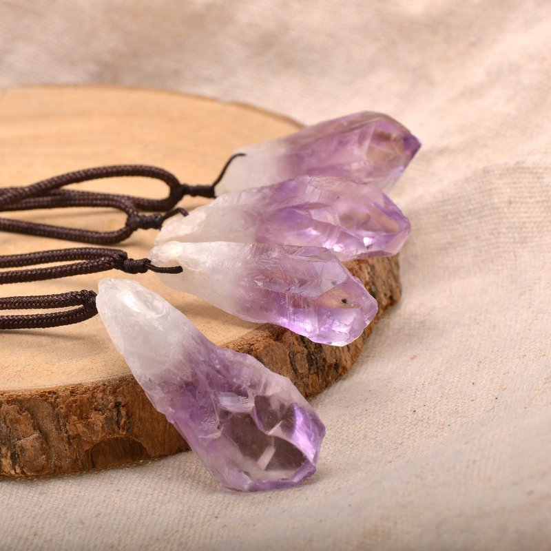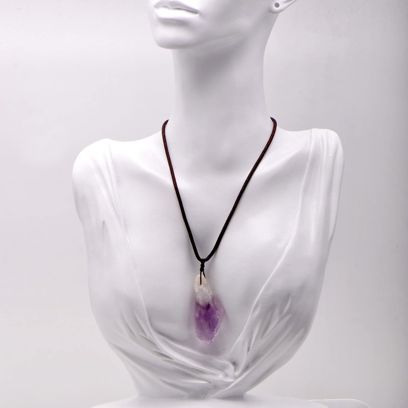 - This necklace is made in natural amethyst crystal, stringed with dark brown rope