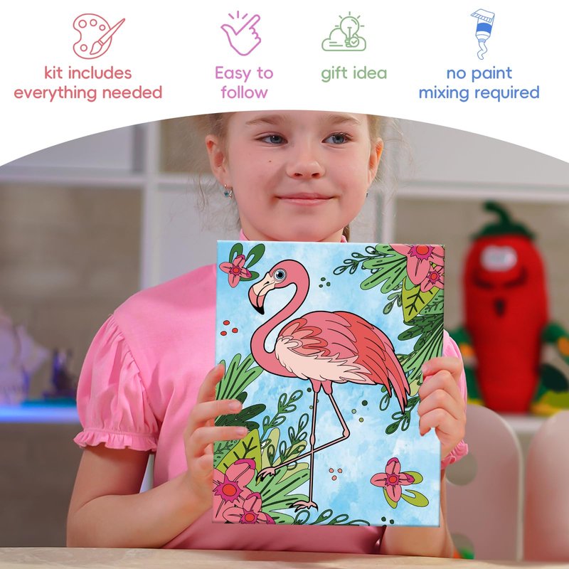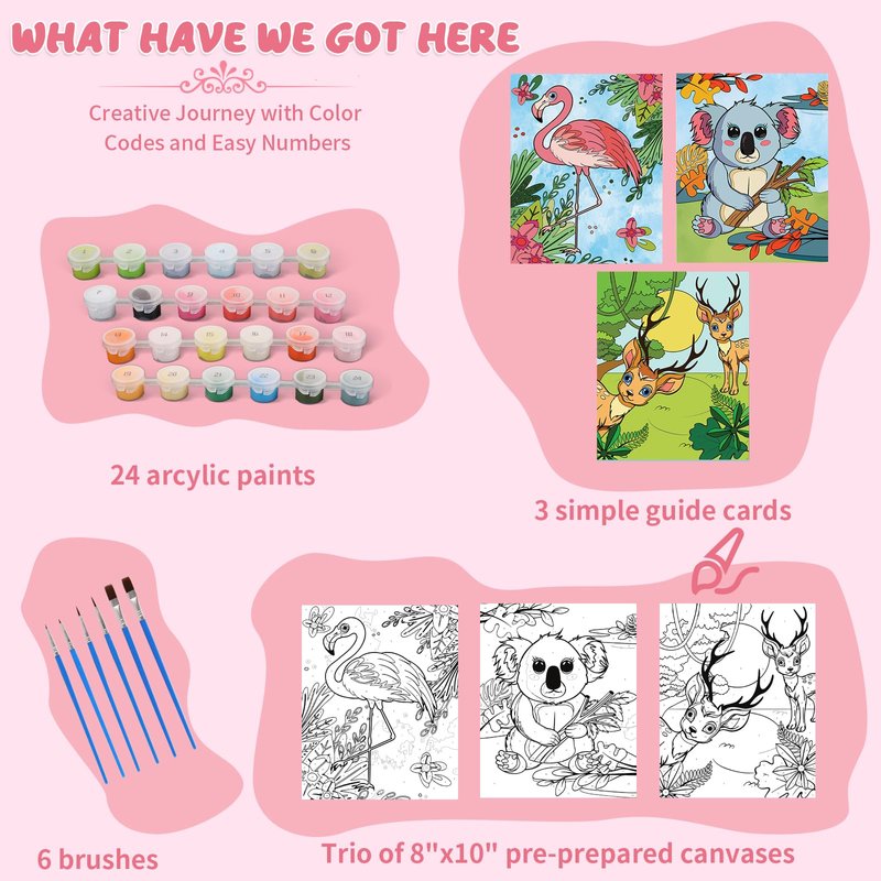 Unleash a world of color, creativity, and fun with our premium Paint by Numbers Kit for Kids! Designed to spark joy and foster artistic skills, this all-inclusive set is the perfect blend of education and entertainment, making it a must-have for young artists aged 6-12. Whether you have an aspiring Da Vinci or a little one just discovering their love for art, our kit is tailored to delight and inspire. Our Paint by Numbers Kit for Kids comes packed with everything your child needs to dive into the magical world of painting: three beautifully framed canvases featuring enchanting animals – a graceful Deer, a flamboyant Flamingo, and a cuddly Koala. Crafted from sturdy materials, each canvas promises an adventure waiting to be colored. With 24 vibrant, non-toxic acrylic paint pots, the spectrum of creativity is endless, ensuring your little artist has all the hues to bring their masterpiece to life. But that’s not all! We've carefully selected six high-quality brushes to allow for precision and ease, making even the finest details a breeze to paint. The clear numbering and color-coding system guide little hands through each step, ensuring a gorgeous finish every time. Plus, with better paint adherence, there's no worry about peeling; just smooth, lasting art to proudly display. So why choose our Paint by Numbers Kit for Kids? Because it's more than just a painting kit; it's an opportunity for growth, learning, and endless fun. Perfect for birthdays, holidays, or just because, this kit is a gift that keeps on giving – to your child’s imagination, confidence, and artistic talents. Dive into the colorful world of paint by numbers today and watch your child's creativity soar to new heights!