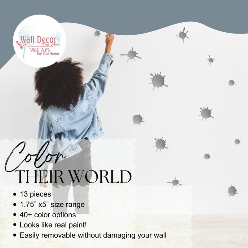 - Splash of Joy –– Illuminate playtime and transform your child's room with this 13-piece paint & slime stickers set! Ranging from 5" to 1.75", these playroom decals can safely brighten up any space. Mess-free and most importantly, fun-filled, these daycare decorations can turn every wall into a blank artist's canvas without any actual paint involved