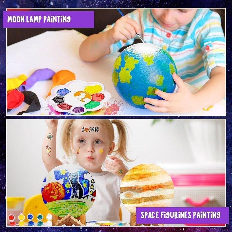 - 🎨 Unique painting set: Let your imagination run wild and create your own star, galaxy or outer space. Use the sealing pens to create unique patterns on your personal planet. This craft set is not only fun to color, but also produces soft light and creates a relaxing atmosphere that helps children fall asleep.