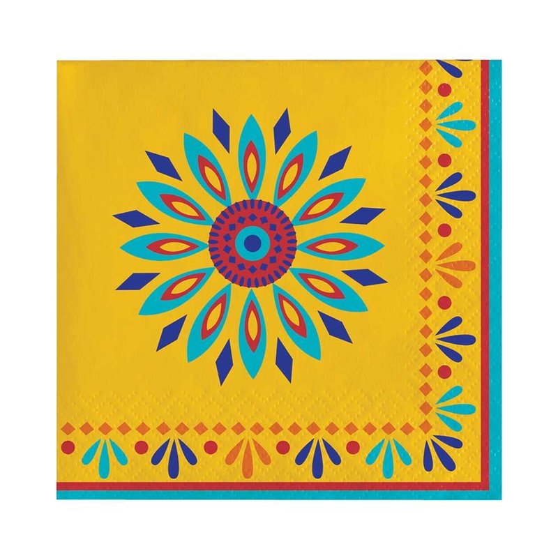 Add our Painted Pottery Beverage Napkins to your tables! Each napkin features a mustard yellow background with a colorful pattern. Measures 5" x 5". Includes 16 - 2 ply paper napkins per package.