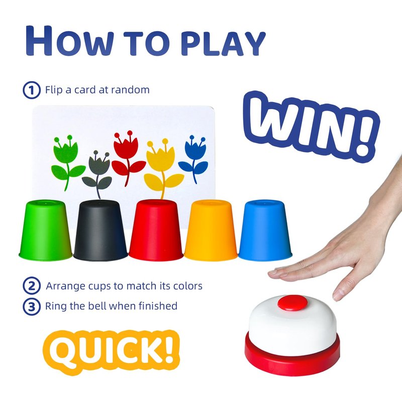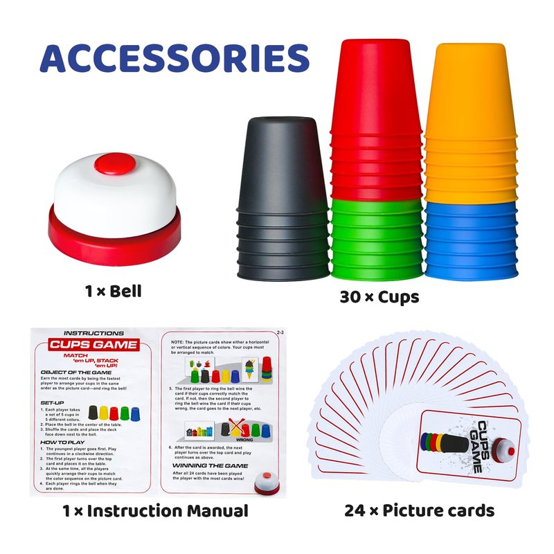 - Includes 30 cups (5 colors), 24 picture cards, 1 bell, and 1 instruction manual, providing a complete gaming experience.