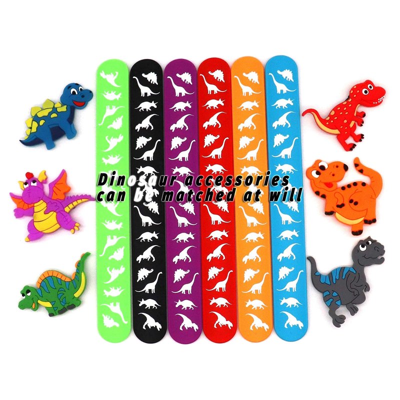 - 1/What will you get with dinosaur slap bracelets: You can get 6 wristbands made of silicone and 6 accessories,which can be combined freely.