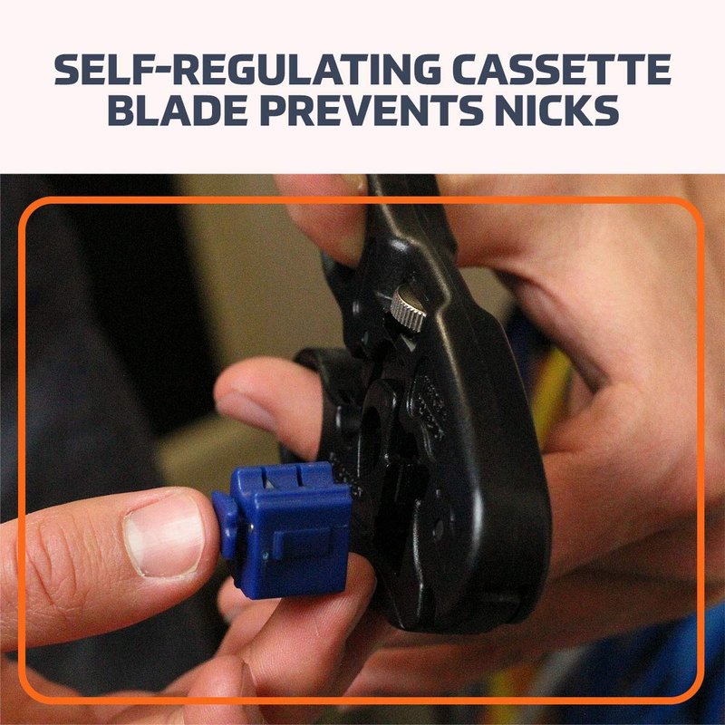 - SELF-REGULATING CASSETTE BLADE: The self-regulating cassette blade prevents nicks, ensuring precise and damage-free stripping for coaxial and twisted pair cables.
