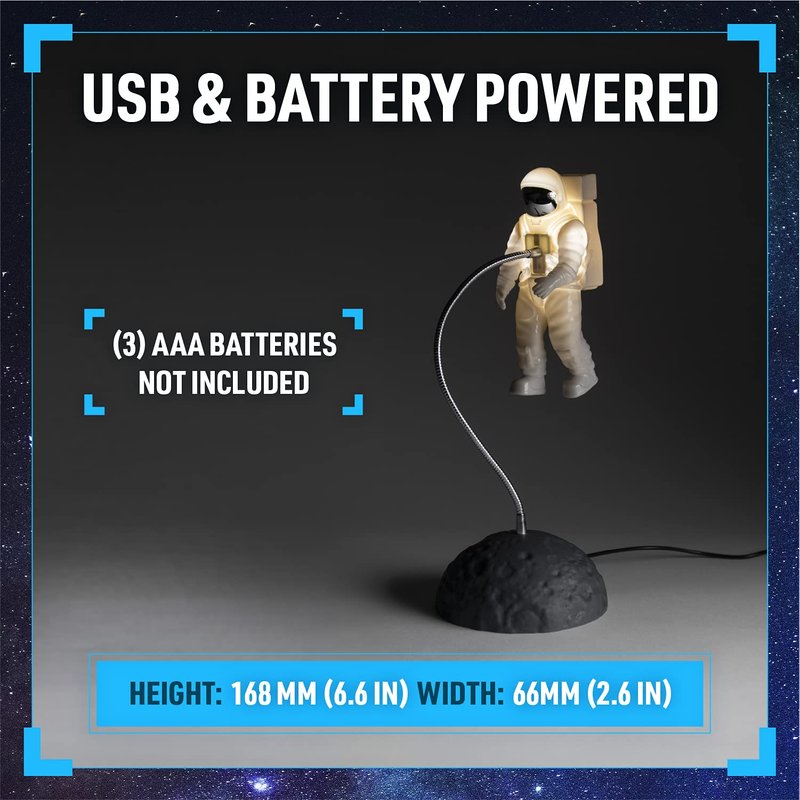 - DETAILS: The Astronaut can be repositioned around the moon base. Light is 160mm tall, is USB or battery powered (3x AAA batteries not included).