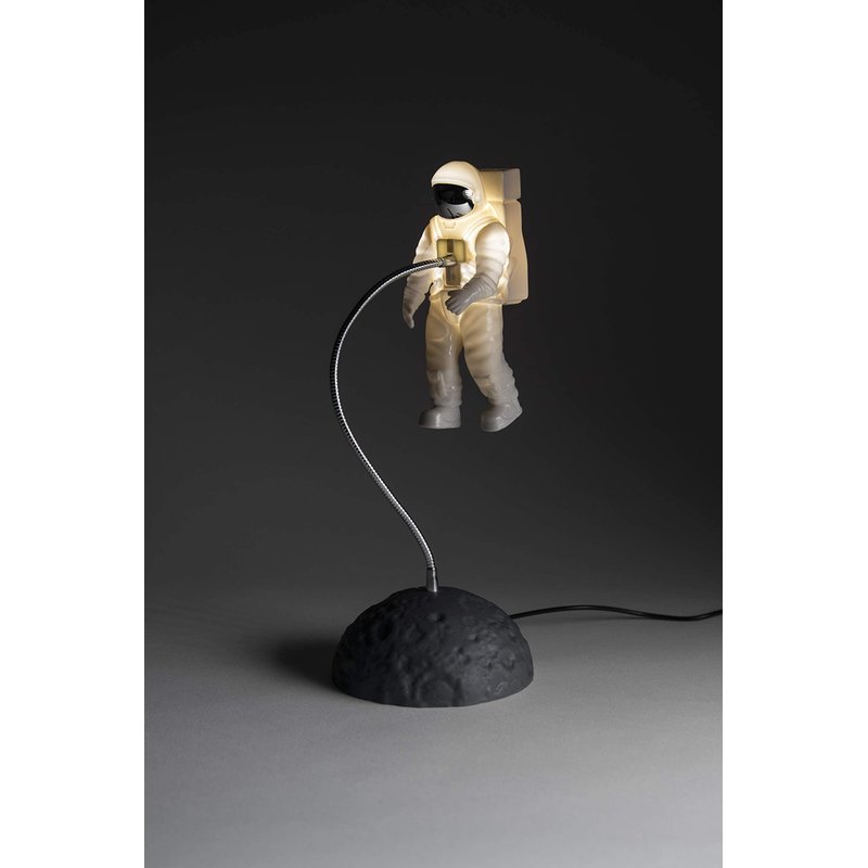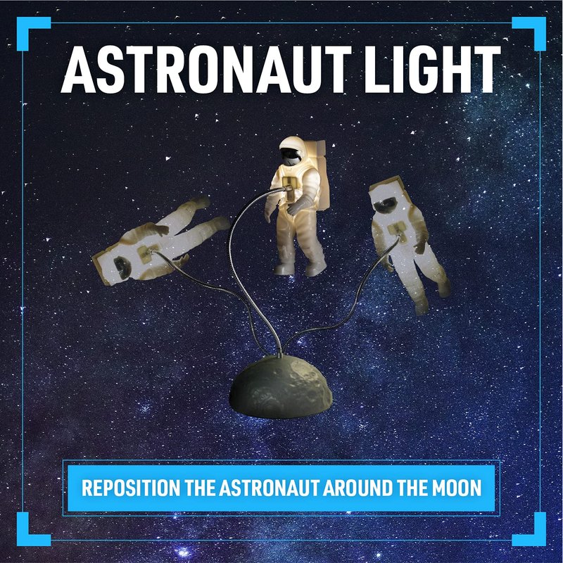 - LIGHT UP THE NIGHT: Perfect bedside lamp, nightlight, or conversation piece; this unique lamp lets you reposition the astronaut to float around the moon at the base.