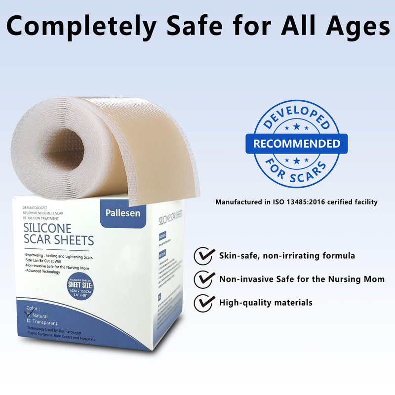 - ✅ Ideal for All Types of Scars: Pallesen Silicone Scar Tape Roll is ideal for a variety of scars, including surgical scars, C-section scars, and acne scars. Just place over old or new scars to reduce itching, redness, and discomfort. The medical-grade silicone mimics the natural skin barrier, preventing further skin damage and providing bandage stability. It also helps with most scar types caused by hypertrophic, post-acne, keloid, injuries & burns scars, and stretch marks.