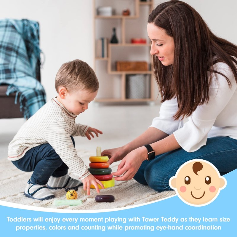 - DEVELOPMENTAL MILESTONES – Toddlers will enjoy every moment playing with Tower Teddy as they learn size properties, colors and counting while promoting eye-hand coordination.