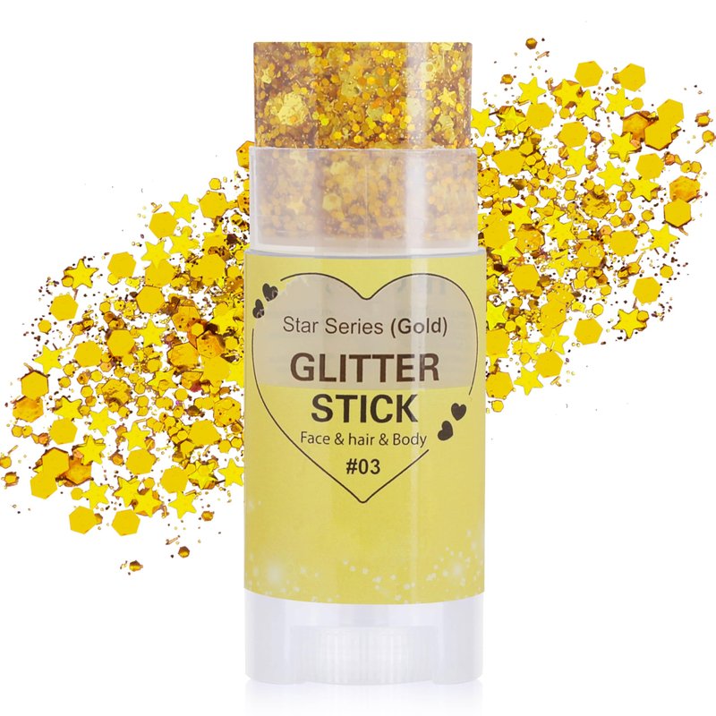 - GOLD GLITTER STICK:Infused with fine and large, square, circular and star shaped,sparkling sequins, the gold face and body glitter sitck creates a dazzling, eye-catching effect. The use of fingers or a brush is highly recommended for more even glitter application