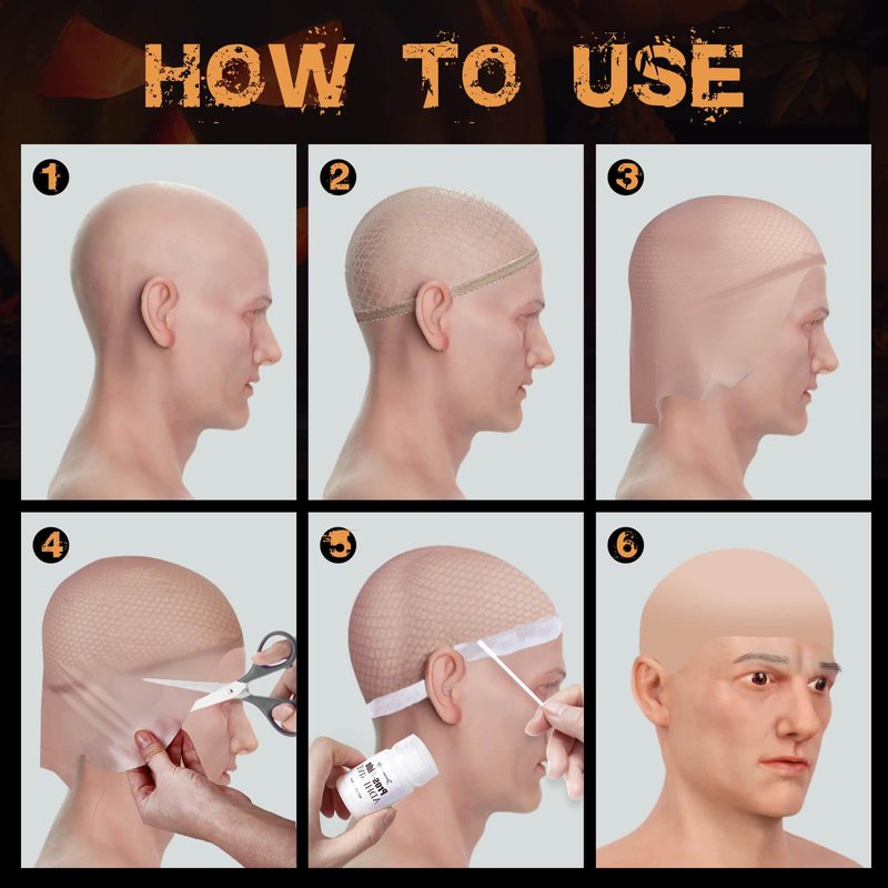 - NOTICE:1.Apply glue to the edge of the bald cap to secure the bald cap in place. It will initially appear milky white and should not be touched. After waiting for 2 minutes to dry, it will become transparent and can be stacked for better adhesion. 2.It is recommended that you add some color,foundation or concealer on the bald cap to match your character.
