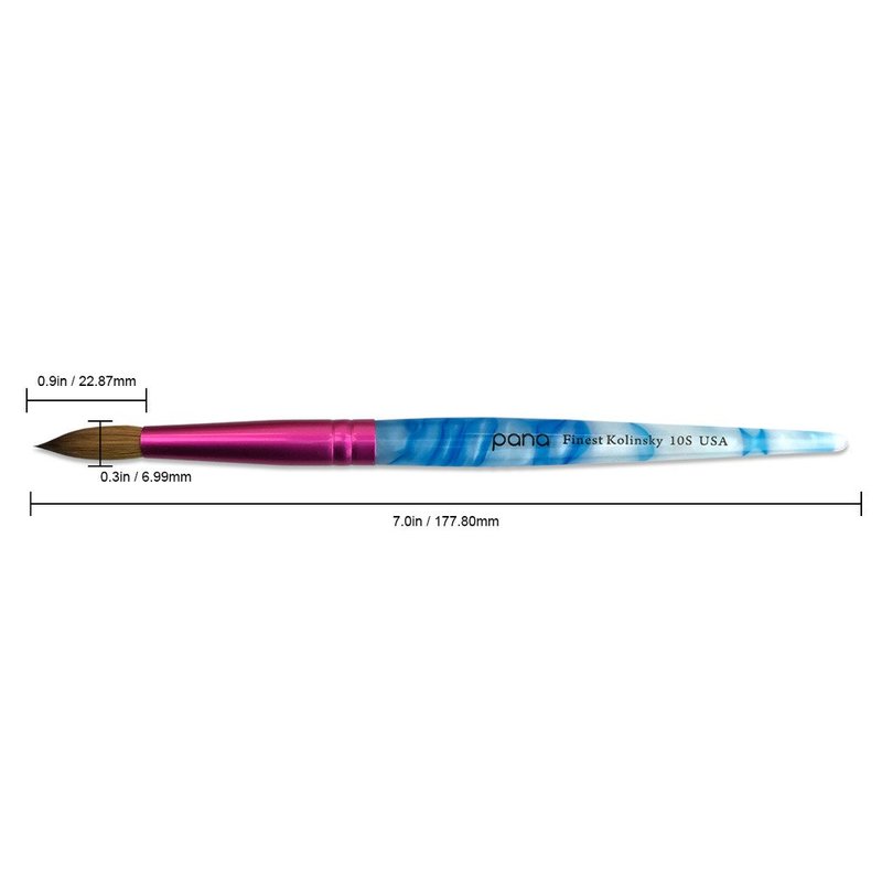 Pana Round acrylic nail brush is designed to have a sturdy white and blue swirl handle with our pink sturdy alloy crimped ferrule has a 10-brush size that is made from a pure Kolinsky hair perfectly made for making a substantial amount of acrylic bead. Each nail brush comes with high-graded sturdy crimped ferrules which locked the brush head and the handle firmly. The ferrule at the base of the brush is designed to maintain a tapered point for precision and absolute control. Pana professional brush has a very smooth finish, and it lasts longer than other normal brushes. Apply acrylic products easily, smoothly and consistently. The more often this brush is used, the smoother effect it will have. Be sure to follow proper brush care tips to extend the life of your brush. Perfect for all nail acrylic needs from fill to full sets and UV builder gel. The quality you can trust. Brush handle is made of precious wood, and the size and weight are designed according to the average palm size and holding habits of American nail users so can be held smoothly, making diversiform nail art easy to come true. Proper usage together with correct care will ensure your nail art pens have longer life, please rinse the new gel nail brush with brush cleaner or liquid monomer thoroughly. After the manicure, please clean the nail polish brush thoroughly with brush cleaner or liquid monomer. Remove as much moisture as possible with paper towel and reshape before storing. The wide range of size makes them suitable for most people, and enough to meet your nail art demands in daily life. Available brush sizes: 6, 8, 10, 12, 14, 16, 20, and 22.