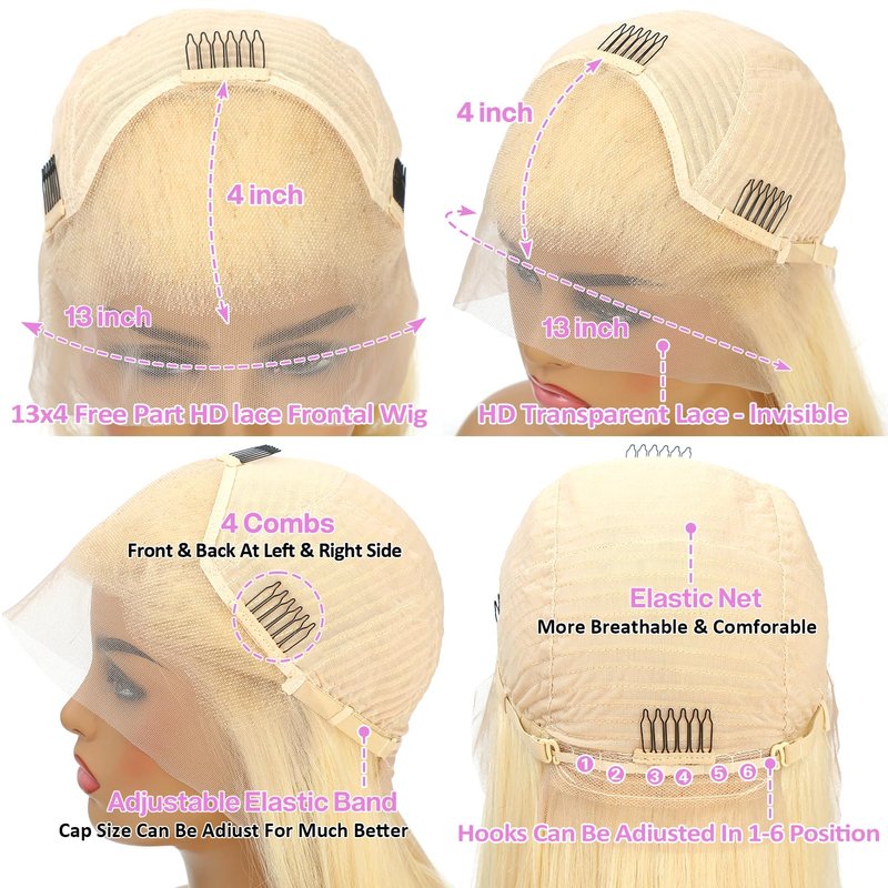 - 613 HD Lace Frontal Wig Cap Size:613 13x4 Transparent HD Lace blends perfectly with All Skin Tones,22.5" Nedium Cap (average size) with 4 Combs and Adjustable Straps,Durable & Easy to Adjust, Fits for Most Customers Perfectly.
