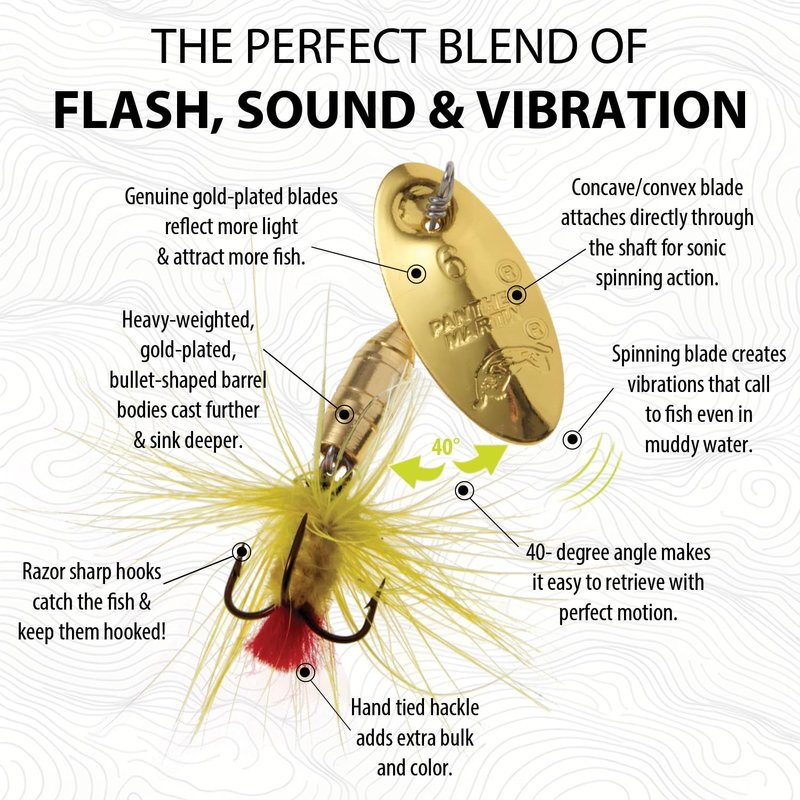 - 🎣 ✅ PANTHER MARTIN: ✅ Unique shaft through blade design creates easiest and fastest spinning action in the world.