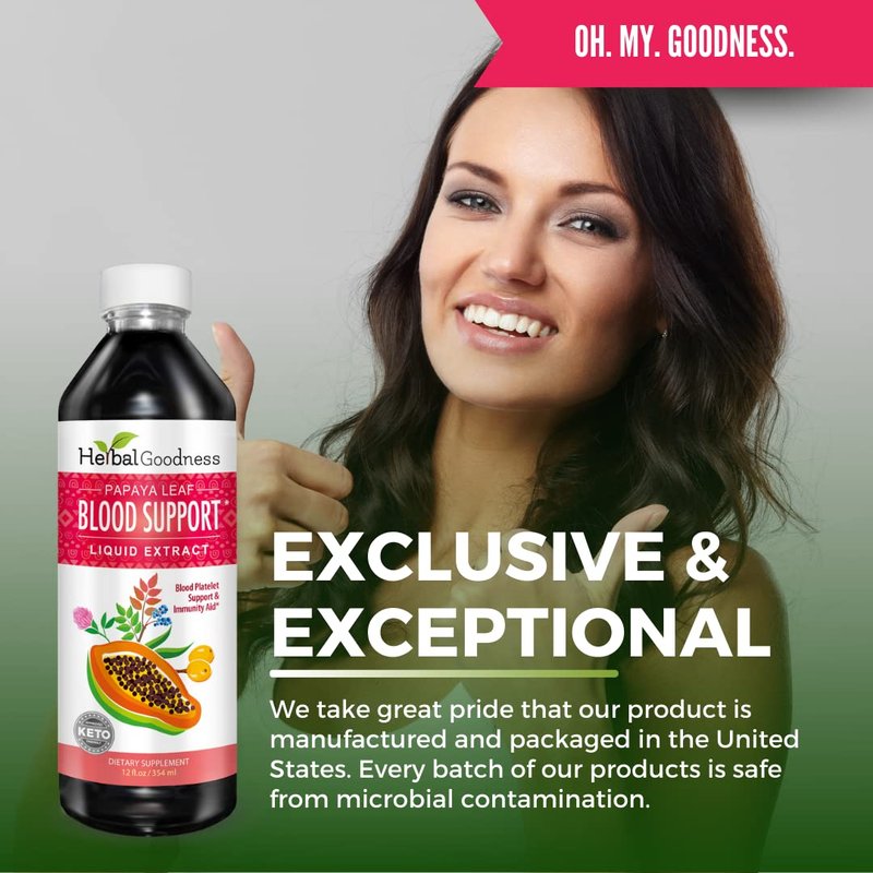 This Papaya Blood Support formula helps promote a healthy and clean blood stream and maintain healthy blood platelet functions. The bloodstream is life itself, and it is important to keep it as clean and pure as possible so that as nutrients are efficiently delivered to the body, waste products are picked up and taken for elimination. This herbal blood re-builder is made up of herbs that are cleansers, and astringents, helpful in naturally boosting platelets, regulating cell function, promoting blood platelet function, and supporting clean bloodstream. HERBAL GOODNESS has pioneered the process of extracting papaya leaf into alcohol-free easy-to-take, affordable capsules. This product is All natural. Manufactured in the US, in an FDA inspected, cGMP Certified facility. Suggested Use: As a nutritional supplement for adults, take two capsules with a glass of water after food, twice a day. Supplement Facts: Serving size: 2 capsules Servings Per Container: 30 Proprietary blend of Papaya Leaf Extract 10:1, *450mg Wildcrafted Red Clover Blossoms, Chaparral Leaf, Licorice root, Poke root, Oregon Grape Root, Stillingia Root, Cascara Sagrada Bark, Sarsaparilla Root, Prickly Ash Bark, Organic Buckthorn bark, Burdock root, Peach Leaf. **Daily Value not established Other ingredients: Veggie pullulan capsules.