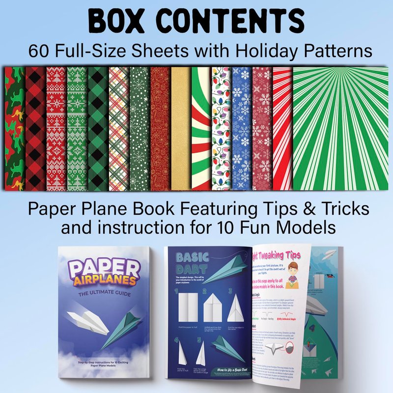 - 60 HOLIDAY THEMED SHEETS - Featuring an assortment of festive styles, most with different designs on each side, these paper airplanes will turn your house into a Christmas wonderland.